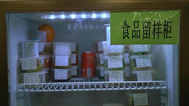 西安宾馆隔离期间每日食品留样柜。西安宾馆供图 红烧茄子、卤鸡腿、三鲜虾仁玉米粒、蘑菇青菜、青菜鸡蛋汤,外加一个橙子。这是2021年12月28日隔离酒店西安宾馆午餐的菜单。