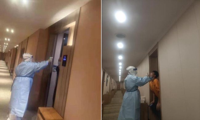 医护人员为留观人员进行核酸检测和健康监测。西安市自然资源和规划局供图 有一名留观人员在隔离期间体温偏高,但核酸检测结果还没出来,心理压力很大。武苗苗和张萌得知后,一方面通过手机视频对这名留观人员进行心理疏导,另一方面让酒店冷冻一些瓶装水,帮助他进行物理降温,缓解心理压力。