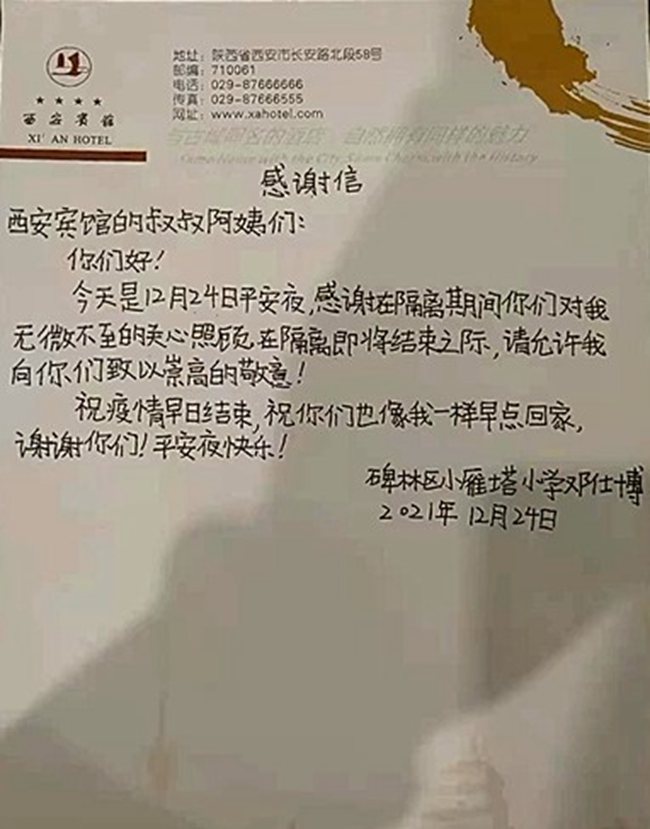 西安市小雁塔小学的学生邓仕博隔离期间给西安宾馆的工作人员所写的感谢信。西安宾馆供图 “谢谢西安宾馆的叔叔阿姨们,祝疫情早日结束,祝你们也像我一样早点回家!新年快乐!”小雁塔小学的一名学生在隔离结束后,为工作人员送上了一份感谢信,短短的话语中是孩子对他们最真诚的祝福,一线的工作很辛苦,但这份小小的温暖就能够让人再次拥有前行的力量。